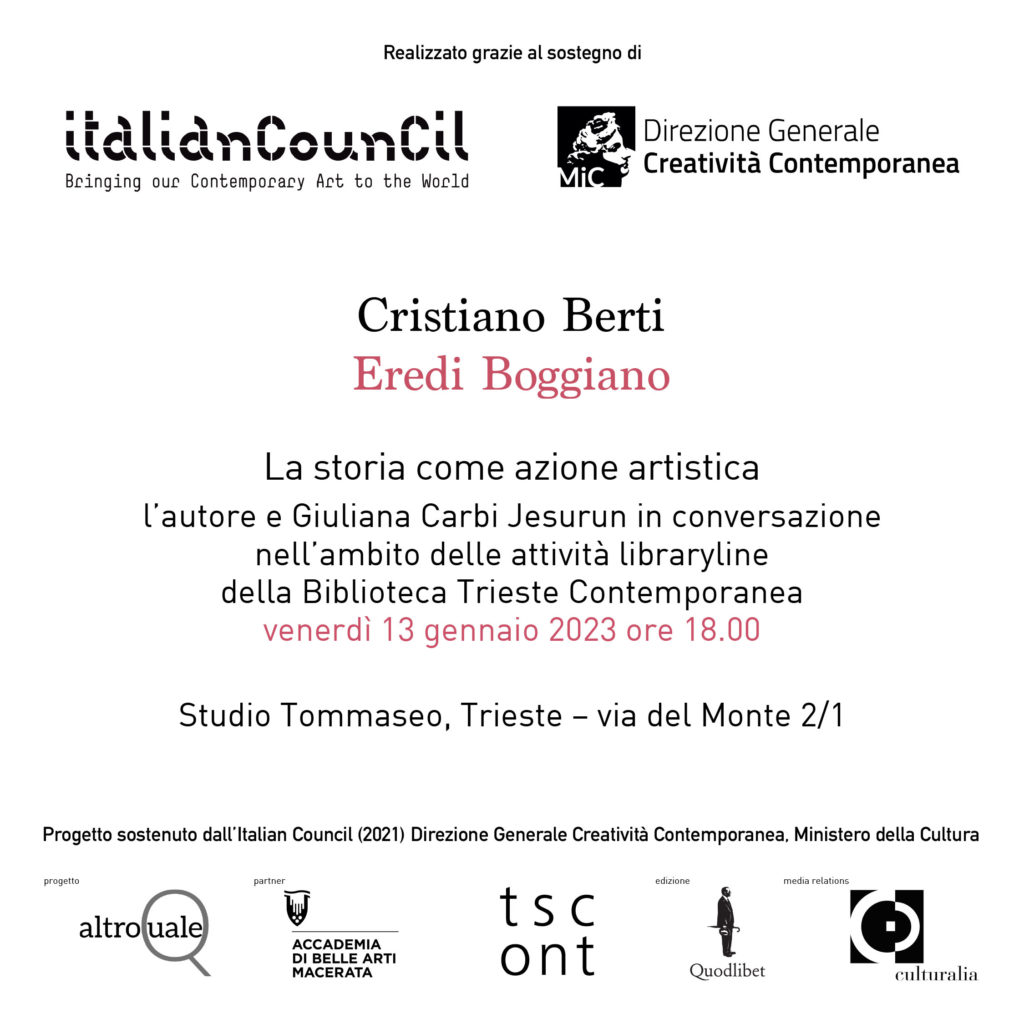 Eredi Boggiano, il nuovo libro d’artista di Cristiano Berti, edito da Quodlibet e vincitore dell’Italian Council (X edizione, 2021), verrà presentato venerdì 13 gennaio 2023 allo Studio Tommaseo, con un evento inserito nell’ambito delle attività libraryline della Biblioteca Trieste Contemporanea: dalle ore 18 l’autore converserà con Giuliana Carbi Jesurun.