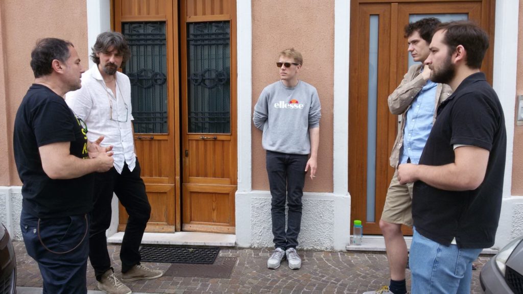 A break during the editing of the film. From left: Adrian Paci, Paolo Comuzzi and Luka Kedžo, Ivo Kušek and Damir Ivanković, members of the Komična Hunta,