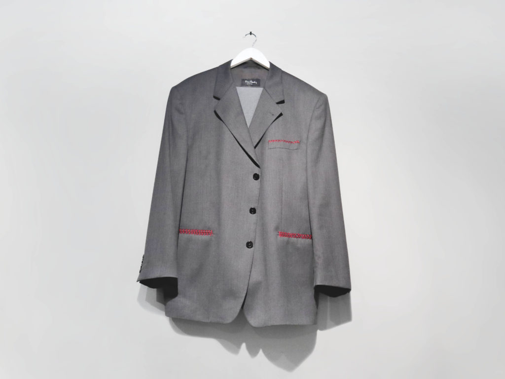 The site of the stroke is an existentialist ready-made consisting of a tailor-made men’s suit that has been rendered essentially unusable, as many of its openings were sewn with a red thread: it is an empty space, a volume that is endowed with shape but cannot have a function, since a (visible) constraint blocks it, and reduces it to being a complement, an impotent accessory, as often happens to human beings in the most important issues of their lives.