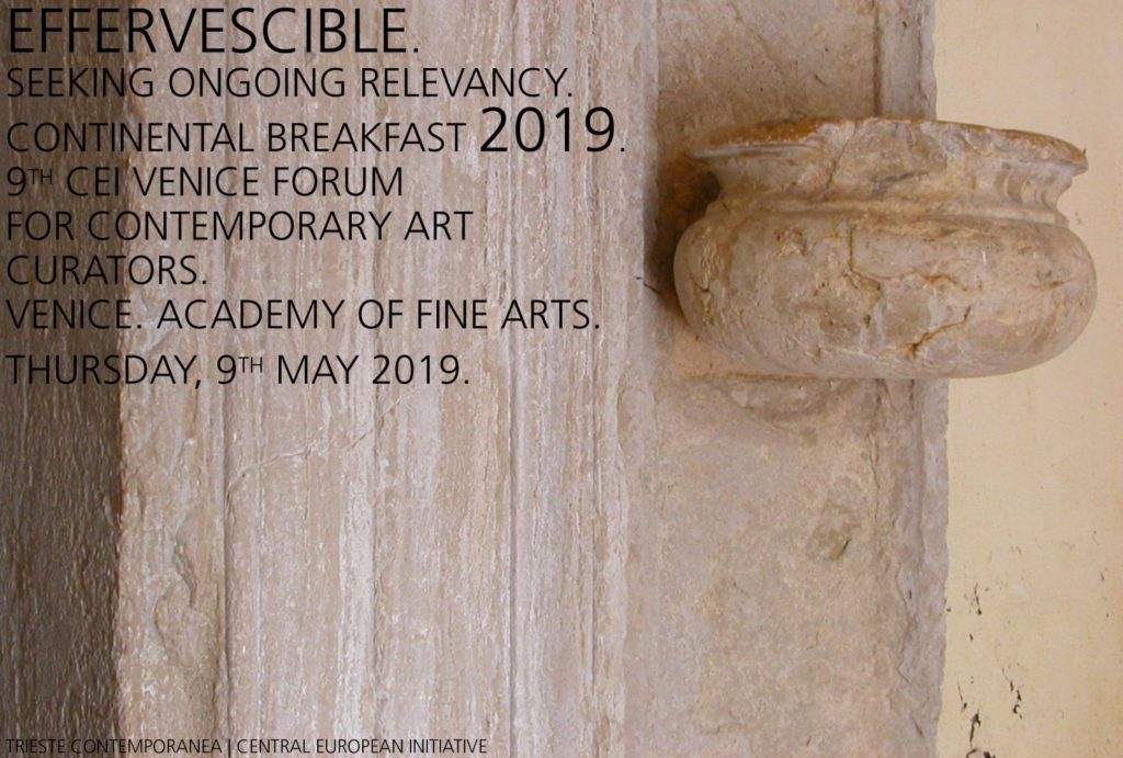 In the spirit of creating a preview-map of what will be of relevance in the context of contemporary debate in the arts in 2019-2020, and thus collecting ongoing curatorial concepts/activities/proposals in this two year period from the international curators invited, the 9th CEI Venice Forum for Contemporary Art Curators will be held at the Academy of Fine Arts in Venice on Thursday 9th May 2019, 2:30 – 6:30 pm.