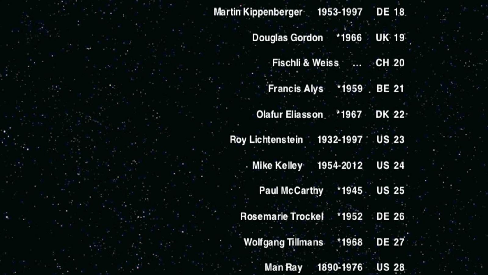 Una lista, quelli dei cento artisti più quotati al mondo, scorre sul cielo stellato mentre il Papa comunica le sue dimissioni. End Credits rappresenta un tentativo, in forma di web collage (la Top 100 List è infatti tratta da http://artfacts.net/en/artists/top100.html del 6 febbraio 2013 mentre l’audio – la voce di Papa Benedetto XVI che rassegna le sue dimissioni – è stato scaricato da http://youtube.com/watch?v=S9qs8vsrLo), di visualizzare lo stato delle cose. Lo stato di un’arte contemporanea, chiusa, isolata nella sua spesso prevalente forma di mercato. Dove è quasi impossibile ascoltare voci fuori del coro.