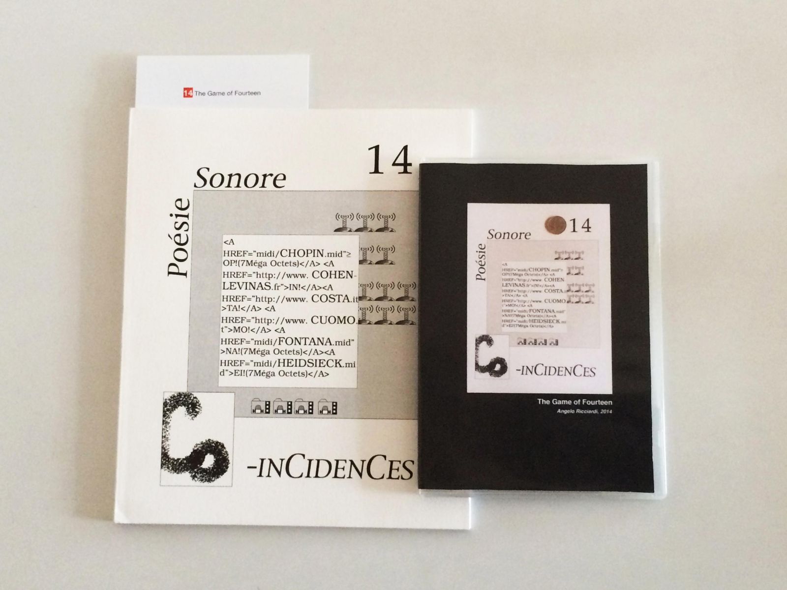 Su di un tavolo un vecchio numero della rivista Co-incidences dedicata alla poesia sonora ed una moneta da un euro. Il visitatore è invitato a giocare il gioco del 14: deve far ruotare la moneta su se stessa facendo in modo che raggiunga il numero 14 in alto a destra sulla rivista. Il video mostra come fare. Gioco nel gioco l’assonanza tra il nome della rivista, Co-incidences, e la moneta che gira, Coin qui danse sur Co-incidences.